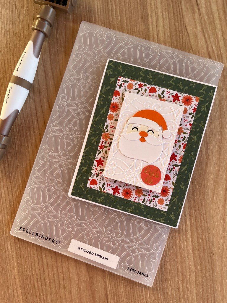 The Orange card features Spellbinders Make It Merry kit paper along with the Stylized Trellis embossing folder and emphera.
