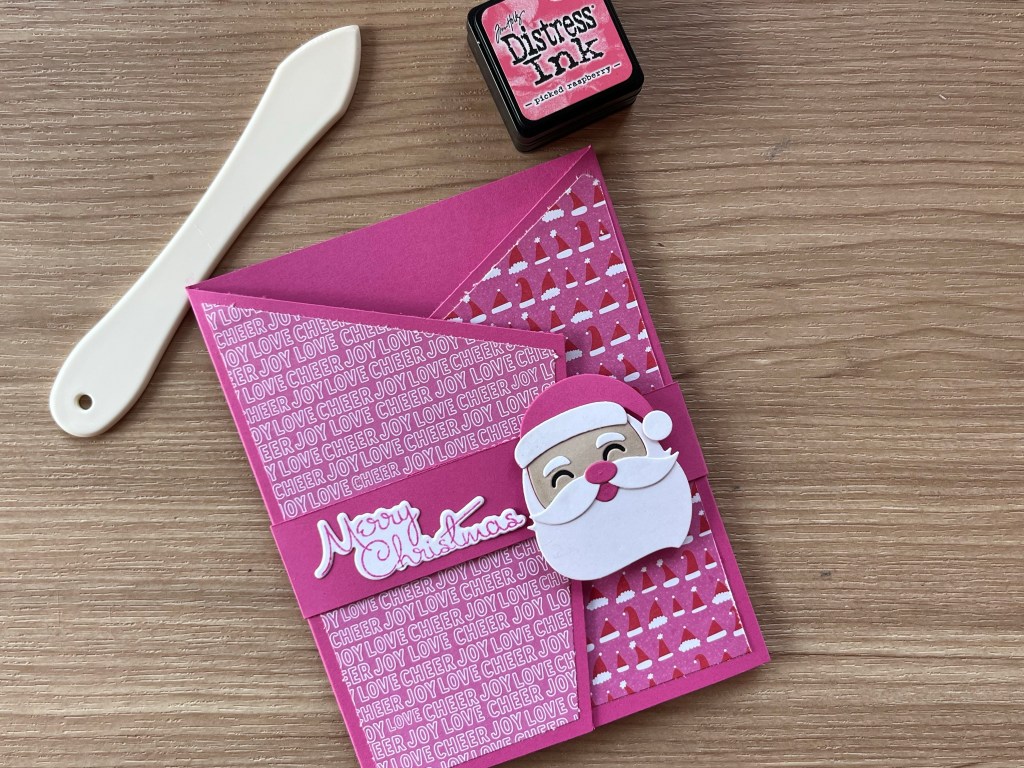 The pink trifold cards has two patterns from the Spellbinders Oh What Fun paper and a pink belly band. The Sentiment comes from Spellbinders Wonderful Christmas stamp set.