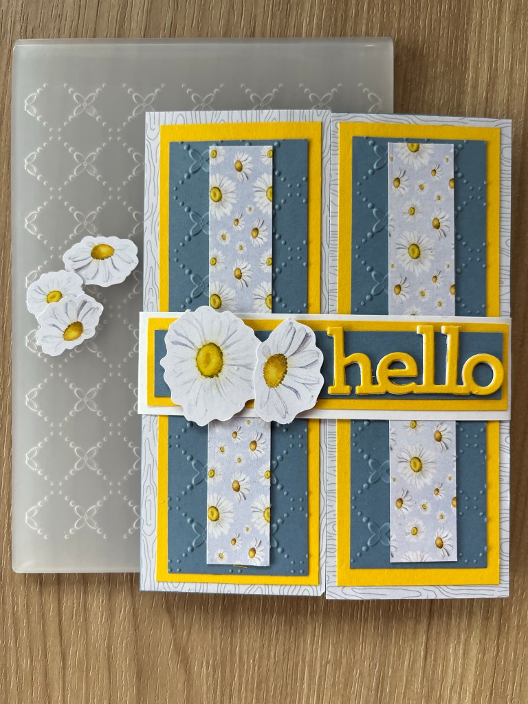 I embossed a white panel for the background using an embossing folder for my background and brought in a sheet of gold metallic paper and some gold embellishments and that finished my card!